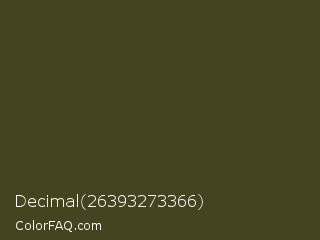 Decimal 26393273366 Color is a very dark yellow color and the nearest color is Thatch Green #403d19. Hex code #454420 and RGB value is rgb(69,68,32). In RGB color space, this color is composed of 27% red, 27% green, 13% blue, In CMYK color space, this color is composed of 0% cyan, 1% magenta, 54% yellow , 73% black , In HSL color space, this color has a hue angle of 58° , 37% saturation and 20% lightness.