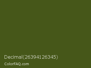 Decimal 26394126345 Color is a very dark lime color and the nearest color is Army Green #4b5320. Hex code #465719 and RGB value is rgb(70,87,25). In RGB color space, this color is composed of 27% red, 34% green, 10% blue, In CMYK color space, this color is composed of 20% cyan, 0% magenta, 71% yellow , 66% black , In HSL color space, this color has a hue angle of 76° , 55% saturation and 22% lightness.