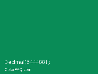 Decimal 6444881 Color is a dark green color and the nearest color is Spanish Green #009150. Hex code #098c57 and RGB value is rgb(9,140,87). In RGB color space, this color is composed of 4% red, 55% green, 34% blue, In CMYK color space, this color is composed of 94% cyan, 0% magenta, 38% yellow , 45% black , In HSL color space, this color has a hue angle of 156° , 88% saturation and 29% lightness.