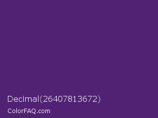 Decimal 26407813672 Color is a dark purple color and the nearest color is Honey Flower #4f1c70. Hex code #512274 and RGB value is rgb(81,34,116). In RGB color space, this color is composed of 32% red, 13% green, 45% blue, In CMYK color space, this color is composed of 30% cyan, 71% magenta, 0% yellow , 55% black , In HSL color space, this color has a hue angle of 274° , 55% saturation and 29% lightness.
