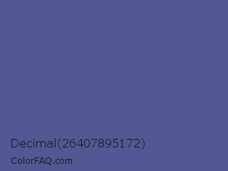 Decimal 26407895172 Color is a normal blue color and the nearest color is UCLA Blue #536895. Hex code #515894 and RGB value is rgb(81,88,148). In RGB color space, this color is composed of 32% red, 35% green, 58% blue, In CMYK color space, this color is composed of 45% cyan, 41% magenta, 0% yellow , 42% black , In HSL color space, this color has a hue angle of 234° , 29% saturation and 45% lightness.