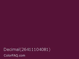 Decimal 26411104081 Color is a very dark magenta color and the nearest color is Wine Berry #591d35. Hex code #561237 and RGB value is rgb(86,18,55). In RGB color space, this color is composed of 34% red, 7% green, 22% blue, In CMYK color space, this color is composed of 0% cyan, 79% magenta, 36% yellow , 66% black , In HSL color space, this color has a hue angle of 327° , 65% saturation and 20% lightness.