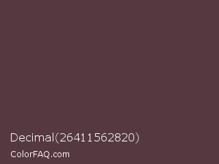 Decimal 26411562820 Color is a dark red color and the nearest color is Dark Puce #4f3a3c. Hex code #563940 and RGB value is rgb(86,57,64). In RGB color space, this color is composed of 34% red, 22% green, 25% blue, In CMYK color space, this color is composed of 0% cyan, 34% magenta, 26% yellow , 66% black , In HSL color space, this color has a hue angle of 346° , 20% saturation and 28% lightness.
