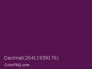 Decimal 26411939176 Color is a very dark magenta color and the nearest color is Clairvoyant #480656. Hex code #571350 and RGB value is rgb(87,19,80). In RGB color space, this color is composed of 34% red, 7% green, 31% blue, In CMYK color space, this color is composed of 0% cyan, 78% magenta, 8% yellow , 66% black , In HSL color space, this color has a hue angle of 306° , 64% saturation and 21% lightness.