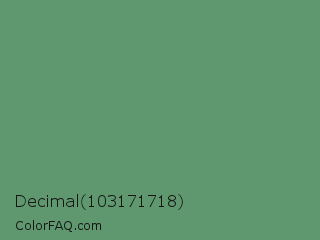 Decimal 103171718 Color is a normal green color and the nearest color is Russian Green #679267. Hex code #5f976e and RGB value is rgb(95,151,110). In RGB color space, this color is composed of 37% red, 59% green, 43% blue, In CMYK color space, this color is composed of 37% cyan, 0% magenta, 27% yellow , 41% black , In HSL color space, this color has a hue angle of 136° , 23% saturation and 48% lightness.