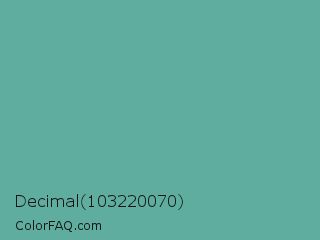 Decimal 103220070 Color is a normal cyan color and the nearest color is Breaker Bay #5da19f. Hex code #5fad9e and RGB value is rgb(95,173,158). In RGB color space, this color is composed of 37% red, 68% green, 62% blue, In CMYK color space, this color is composed of 45% cyan, 0% magenta, 9% yellow , 32% black , In HSL color space, this color has a hue angle of 168° , 32% saturation and 53% lightness.