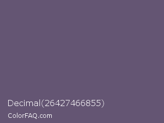 Decimal 26427466855 Color is a normal violet color and the nearest color is Smoky #605b73. Hex code #645573 and RGB value is rgb(100,85,115). In RGB color space, this color is composed of 39% red, 33% green, 45% blue, In CMYK color space, this color is composed of 13% cyan, 26% magenta, 0% yellow , 55% black , In HSL color space, this color has a hue angle of 270° , 15% saturation and 39% lightness.