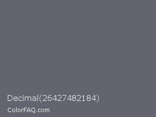 Decimal 26427482184 Color is a normal indigo color and the nearest color is Shuttle Gray #5f6672. Hex code #646370 and RGB value is rgb(100,99,112). In RGB color space, this color is composed of 39% red, 39% green, 44% blue, In CMYK color space, this color is composed of 11% cyan, 12% magenta, 0% yellow , 56% black , In HSL color space, this color has a hue angle of 245° , 6% saturation and 41% lightness.