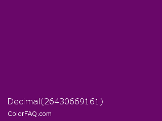 Decimal 26430669161 Color is a very dark magenta color and the nearest color is Midnight #702670. Hex code #690769 and RGB value is rgb(105,7,105). In RGB color space, this color is composed of 41% red, 3% green, 41% blue, In CMYK color space, this color is composed of 0% cyan, 93% magenta, 0% yellow , 59% black , In HSL color space, this color has a hue angle of 300° , 88% saturation and 22% lightness.