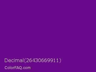 Decimal 26430669911 Color is a dark purple color and the nearest color is Purple #660099. Hex code #690889 and RGB value is rgb(105,8,137). In RGB color space, this color is composed of 41% red, 3% green, 54% blue, In CMYK color space, this color is composed of 23% cyan, 94% magenta, 0% yellow , 46% black , In HSL color space, this color has a hue angle of 285° , 89% saturation and 28% lightness.