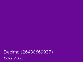 Decimal 26430669937 Color is a normal purple color and the nearest color is Purple #660099. Hex code #690897 and RGB value is rgb(105,8,151). In RGB color space, this color is composed of 41% red, 3% green, 59% blue, In CMYK color space, this color is composed of 30% cyan, 95% magenta, 0% yellow , 41% black , In HSL color space, this color has a hue angle of 281° , 90% saturation and 31% lightness.