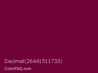Decimal 26441511733 Color is a very dark rose color and the nearest color is Siren #7a013a. Hex code #700137 and RGB value is rgb(112,1,55). In RGB color space, this color is composed of 44% red, 0% green, 22% blue, In CMYK color space, this color is composed of 0% cyan, 99% magenta, 51% yellow , 56% black , In HSL color space, this color has a hue angle of 331° , 98% saturation and 22% lightness.