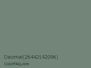 Decimal 26442142096 Color is a normal green color and the nearest color is Xanadu #738678. Hex code #708576 and RGB value is rgb(112,133,118). In RGB color space, this color is composed of 44% red, 52% green, 46% blue, In CMYK color space, this color is composed of 16% cyan, 0% magenta, 11% yellow , 48% black , In HSL color space, this color has a hue angle of 137° , 9% saturation and 48% lightness.