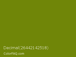 Decimal 26442142518 Color is a dark yellow color and the nearest color is Olive #808000. Hex code #708608 and RGB value is rgb(112,134,8). In RGB color space, this color is composed of 44% red, 53% green, 3% blue, In CMYK color space, this color is composed of 16% cyan, 0% magenta, 94% yellow , 47% black , In HSL color space, this color has a hue angle of 70° , 89% saturation and 28% lightness.