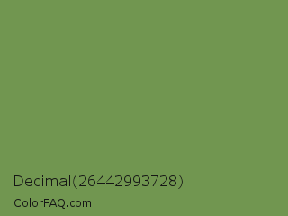 Decimal 26442993728 Color is a normal green color and the nearest color is Palm Leaf #6f9940. Hex code #719650 and RGB value is rgb(113,150,80). In RGB color space, this color is composed of 44% red, 59% green, 31% blue, In CMYK color space, this color is composed of 25% cyan, 0% magenta, 47% yellow , 41% black , In HSL color space, this color has a hue angle of 92° , 30% saturation and 45% lightness.