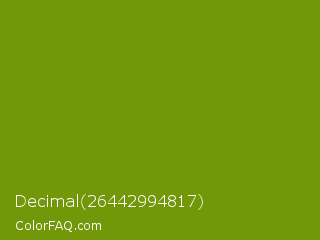 Decimal 26442994817 Color is a normal lime color and the nearest color is Limeade #6f9d02. Hex code #719809 and RGB value is rgb(113,152,9). In RGB color space, this color is composed of 44% red, 60% green, 4% blue, In CMYK color space, this color is composed of 26% cyan, 0% magenta, 94% yellow , 40% black , In HSL color space, this color has a hue angle of 76° , 89% saturation and 32% lightness.