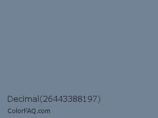 Decimal 26443388197 Color is a normal blue color and the nearest color is Slate Gray #708090. Hex code #728295 and RGB value is rgb(114,130,149). In RGB color space, this color is composed of 45% red, 51% green, 58% blue, In CMYK color space, this color is composed of 23% cyan, 13% magenta, 0% yellow , 42% black , In HSL color space, this color has a hue angle of 213° , 14% saturation and 52% lightness.