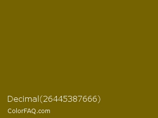 Decimal 26445387666 Color is a dark yellow color and the nearest color is Yukon Gold #7b6608. Hex code #756200 and RGB value is rgb(117,98,0). In RGB color space, this color is composed of 46% red, 38% green, 0% blue, In CMYK color space, this color is composed of 0% cyan, 16% magenta, 100% yellow , 54% black , In HSL color space, this color has a hue angle of 50° , 100% saturation and 23% lightness.