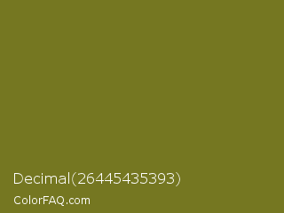 Decimal 26445435393 Color is a dark yellow color and the nearest color is Crete #737829. Hex code #757721 and RGB value is rgb(117,119,33). In RGB color space, this color is composed of 46% red, 47% green, 13% blue, In CMYK color space, this color is composed of 2% cyan, 0% magenta, 72% yellow , 53% black , In HSL color space, this color has a hue angle of 61° , 57% saturation and 30% lightness.
