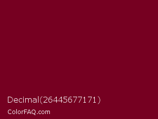 Decimal 26445677171 Color is a dark rose color and the nearest color is Burgundy #800020. Hex code #760021 and RGB value is rgb(118,0,33). In RGB color space, this color is composed of 46% red, 0% green, 13% blue, In CMYK color space, this color is composed of 0% cyan, 100% magenta, 72% yellow , 54% black , In HSL color space, this color has a hue angle of 343° , 100% saturation and 23% lightness.