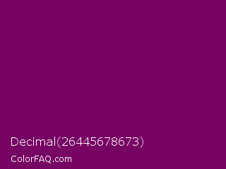 Decimal 26445678673 Color is a dark magenta color and the nearest color is Cardinal Pink #8c055e. Hex code #760263 and RGB value is rgb(118,2,99). In RGB color space, this color is composed of 46% red, 1% green, 39% blue, In CMYK color space, this color is composed of 0% cyan, 98% magenta, 16% yellow , 54% black , In HSL color space, this color has a hue angle of 310° , 97% saturation and 24% lightness.