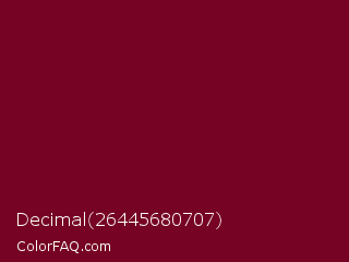 Decimal 26445680707 Color is a dark rose color and the nearest color is Burgundy #800020. Hex code #760323 and RGB value is rgb(118,3,35). In RGB color space, this color is composed of 46% red, 1% green, 14% blue, In CMYK color space, this color is composed of 0% cyan, 97% magenta, 70% yellow , 54% black , In HSL color space, this color has a hue angle of 343° , 95% saturation and 24% lightness.