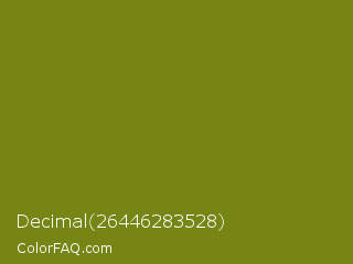 Decimal 26446283528 Color is a dark yellow color and the nearest color is Trendy Green #7c881a. Hex code #768514 and RGB value is rgb(118,133,20). In RGB color space, this color is composed of 46% red, 52% green, 8% blue, In CMYK color space, this color is composed of 11% cyan, 0% magenta, 85% yellow , 48% black , In HSL color space, this color has a hue angle of 68° , 74% saturation and 30% lightness.