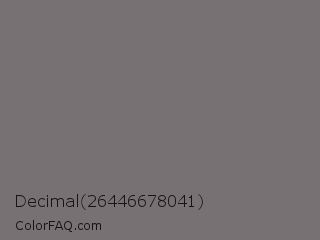 Decimal 26446678041 Color is a normal rose color and the nearest color is Sonic Silver #757575. Hex code #777173 and RGB value is rgb(119,113,115). In RGB color space, this color is composed of 47% red, 44% green, 45% blue, In CMYK color space, this color is composed of 0% cyan, 5% magenta, 3% yellow , 53% black , In HSL color space, this color has a hue angle of 340° , 3% saturation and 45% lightness.