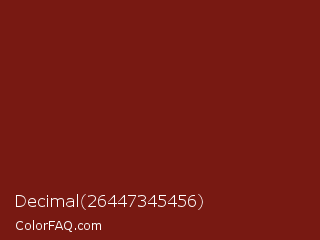 Decimal 26447345456 Color is a dark red color and the nearest color is UP Maroon #7b1113. Hex code #781912 and RGB value is rgb(120,25,18). In RGB color space, this color is composed of 47% red, 10% green, 7% blue, In CMYK color space, this color is composed of 0% cyan, 79% magenta, 85% yellow , 53% black , In HSL color space, this color has a hue angle of 4° , 74% saturation and 27% lightness.
