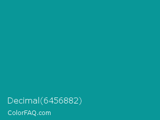 Decimal 6456882 Color is a normal cyan color and the nearest color is Viridian Green #009698. Hex code #099798 and RGB value is rgb(9,151,152). In RGB color space, this color is composed of 4% red, 59% green, 60% blue, In CMYK color space, this color is composed of 94% cyan, 1% magenta, 0% yellow , 40% black , In HSL color space, this color has a hue angle of 180° , 89% saturation and 32% lightness.