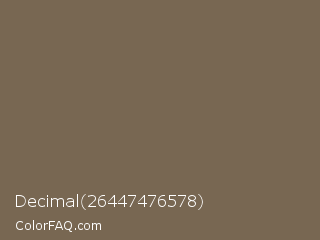 Decimal 26447476578 Color is a normal orange color and the nearest color is Coffee #706555. Hex code #786752 and RGB value is rgb(120,103,82). In RGB color space, this color is composed of 47% red, 40% green, 32% blue, In CMYK color space, this color is composed of 0% cyan, 14% magenta, 32% yellow , 53% black , In HSL color space, this color has a hue angle of 33° , 19% saturation and 40% lightness.