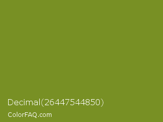 Decimal 26447544850 Color is a normal lime color and the nearest color is Wasabi #788a25. Hex code #789024 and RGB value is rgb(120,144,36). In RGB color space, this color is composed of 47% red, 56% green, 14% blue, In CMYK color space, this color is composed of 17% cyan, 0% magenta, 75% yellow , 44% black , In HSL color space, this color has a hue angle of 73° , 60% saturation and 35% lightness.