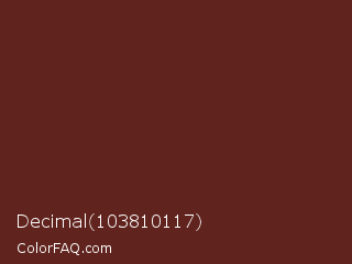 Decimal 103810117 Color is a dark red color and the nearest color is Espresso #612718. Hex code #60231d and RGB value is rgb(96,35,29). In RGB color space, this color is composed of 38% red, 14% green, 11% blue, In CMYK color space, this color is composed of 0% cyan, 64% magenta, 70% yellow , 62% black , In HSL color space, this color has a hue angle of 5° , 54% saturation and 25% lightness.