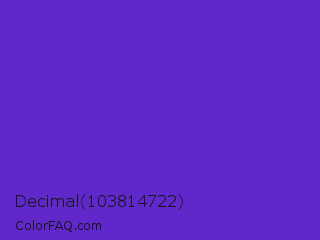 Decimal 103814722 Color is a normal violet color and the nearest color is Purple Heart Crayola #652dc1. Hex code #6027ca and RGB value is rgb(96,39,202). In RGB color space, this color is composed of 38% red, 15% green, 79% blue, In CMYK color space, this color is composed of 52% cyan, 81% magenta, 0% yellow , 21% black , In HSL color space, this color has a hue angle of 261° , 68% saturation and 47% lightness.