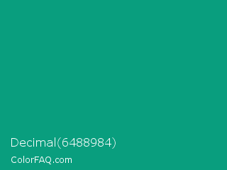 Decimal 6488984 Color is a normal cyan color and the nearest color is Gossamer #069b81. Hex code #099e7e and RGB value is rgb(9,158,126). In RGB color space, this color is composed of 4% red, 62% green, 49% blue, In CMYK color space, this color is composed of 94% cyan, 0% magenta, 20% yellow , 38% black , In HSL color space, this color has a hue angle of 167° , 89% saturation and 33% lightness.