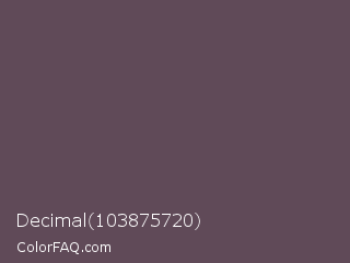 Decimal 103875720 Color is a normal magenta color and the nearest color is Don Juan #5d4c51. Hex code #604a58 and RGB value is rgb(96,74,88). In RGB color space, this color is composed of 38% red, 29% green, 35% blue, In CMYK color space, this color is composed of 0% cyan, 23% magenta, 8% yellow , 62% black , In HSL color space, this color has a hue angle of 322° , 13% saturation and 33% lightness.