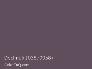 Decimal 103879958 Color is a normal magenta color and the nearest color is Zambezi #685558. Hex code #604e5c and RGB value is rgb(96,78,92). In RGB color space, this color is composed of 38% red, 31% green, 36% blue, In CMYK color space, this color is composed of 0% cyan, 19% magenta, 4% yellow , 62% black , In HSL color space, this color has a hue angle of 313° , 10% saturation and 34% lightness.