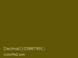 Decimal 103887991 Color is a very dark yellow color and the nearest color is Saratoga #555b10. Hex code #605605 and RGB value is rgb(96,86,5). In RGB color space, this color is composed of 38% red, 34% green, 2% blue, In CMYK color space, this color is composed of 0% cyan, 10% magenta, 95% yellow , 62% black , In HSL color space, this color has a hue angle of 53° , 90% saturation and 20% lightness.