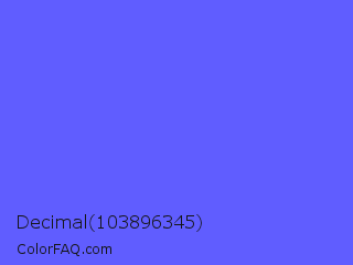 Decimal 103896345 Color is a light indigo color and the nearest color is Very Light Blue #6666ff. Hex code #605dff and RGB value is rgb(96,93,255). In RGB color space, this color is composed of 38% red, 36% green, 100% blue, In CMYK color space, this color is composed of 62% cyan, 64% magenta, 0% yellow , 0% black , In HSL color space, this color has a hue angle of 241° , 100% saturation and 68% lightness.