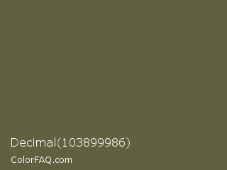 Decimal 103899986 Color is a normal yellow color and the nearest color is Hemlock #5e5d3b. Hex code #606140 and RGB value is rgb(96,97,64). In RGB color space, this color is composed of 38% red, 38% green, 25% blue, In CMYK color space, this color is composed of 1% cyan, 0% magenta, 34% yellow , 62% black , In HSL color space, this color has a hue angle of 62° , 20% saturation and 32% lightness.