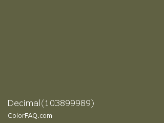 Decimal 103899989 Color is a normal yellow color and the nearest color is Finch #626649. Hex code #606143 and RGB value is rgb(96,97,67). In RGB color space, this color is composed of 38% red, 38% green, 26% blue, In CMYK color space, this color is composed of 1% cyan, 0% magenta, 31% yellow , 62% black , In HSL color space, this color has a hue angle of 62° , 18% saturation and 32% lightness.
