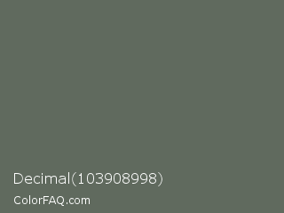 Decimal 103908998 Color is a normal green color and the nearest color is Storm Dust #646463. Hex code #606a5e and RGB value is rgb(96,106,94). In RGB color space, this color is composed of 38% red, 42% green, 37% blue, In CMYK color space, this color is composed of 9% cyan, 0% magenta, 11% yellow , 58% black , In HSL color space, this color has a hue angle of 110° , 6% saturation and 39% lightness.