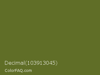 Decimal 103913045 Color is a dark lime color and the nearest color is Fern Frond #657220. Hex code #606e27 and RGB value is rgb(96,110,39). In RGB color space, this color is composed of 38% red, 43% green, 15% blue, In CMYK color space, this color is composed of 13% cyan, 0% magenta, 65% yellow , 57% black , In HSL color space, this color has a hue angle of 72° , 48% saturation and 29% lightness.