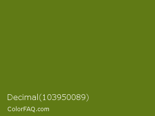 Decimal 103950089 Color is a dark lime color and the nearest color is Fern Frond #657220. Hex code #607a15 and RGB value is rgb(96,122,21). In RGB color space, this color is composed of 38% red, 48% green, 8% blue, In CMYK color space, this color is composed of 21% cyan, 0% magenta, 83% yellow , 52% black , In HSL color space, this color has a hue angle of 75° , 71% saturation and 28% lightness.