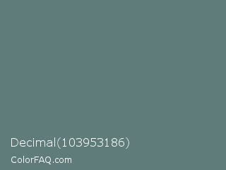 Decimal 103953186 Color is a normal cyan color and the nearest color is Nevada #646e75. Hex code #607c7a and RGB value is rgb(96,124,122). In RGB color space, this color is composed of 38% red, 49% green, 48% blue, In CMYK color space, this color is composed of 23% cyan, 0% magenta, 2% yellow , 51% black , In HSL color space, this color has a hue angle of 176° , 13% saturation and 43% lightness.