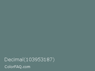 Decimal 103953187 Color is a normal cyan color and the nearest color is Aurometalsaurus #6e7f80. Hex code #607c7b and RGB value is rgb(96,124,123). In RGB color space, this color is composed of 38% red, 49% green, 48% blue, In CMYK color space, this color is composed of 23% cyan, 0% magenta, 1% yellow , 51% black , In HSL color space, this color has a hue angle of 178° , 13% saturation and 43% lightness.