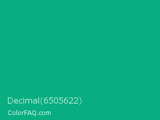 Decimal 6505622 Color is a normal green color and the nearest color is Green Munsell #00a877. Hex code #09ae80 and RGB value is rgb(9,174,128). In RGB color space, this color is composed of 4% red, 68% green, 50% blue, In CMYK color space, this color is composed of 95% cyan, 0% magenta, 26% yellow , 32% black , In HSL color space, this color has a hue angle of 163° , 90% saturation and 36% lightness.