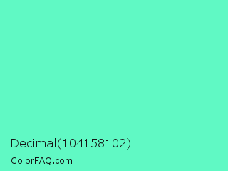 Decimal 104158102 Color is a light green color and the nearest color is Aquamarine #7fffd4. Hex code #60f9c4 and RGB value is rgb(96,249,196). In RGB color space, this color is composed of 38% red, 98% green, 77% blue, In CMYK color space, this color is composed of 61% cyan, 0% magenta, 21% yellow , 2% black , In HSL color space, this color has a hue angle of 159° , 93% saturation and 68% lightness.