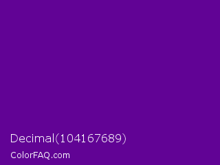 Decimal 104167689 Color is a dark purple color and the nearest color is Purple #660099. Hex code #610395 and RGB value is rgb(97,3,149). In RGB color space, this color is composed of 38% red, 1% green, 58% blue, In CMYK color space, this color is composed of 35% cyan, 98% magenta, 0% yellow , 42% black , In HSL color space, this color has a hue angle of 279° , 96% saturation and 30% lightness.