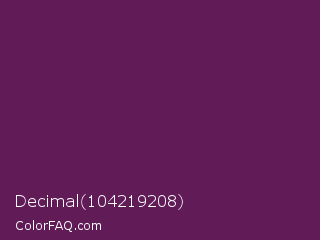 Decimal 104219208 Color is a dark magenta color and the nearest color is Palatinate Purple #682860. Hex code #611c58 and RGB value is rgb(97,28,88). In RGB color space, this color is composed of 38% red, 11% green, 35% blue, In CMYK color space, this color is composed of 0% cyan, 71% magenta, 9% yellow , 62% black , In HSL color space, this color has a hue angle of 308° , 55% saturation and 25% lightness.